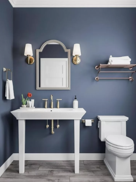 Окраска – универсальный и надежный способ отделки, подходящий для любых зон ванной комнаты. Рекомендуется выбирать водостойкие моющиеся краски.