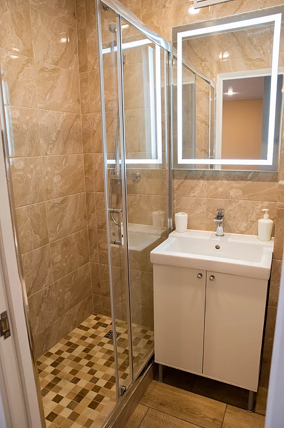 - Вместо ванны и душевой кабины можно установить душевое устройство со сливом в полу и защитной перегородкой из матового стекла. Желательно оборудовать в такой душевой системе теплый пол.